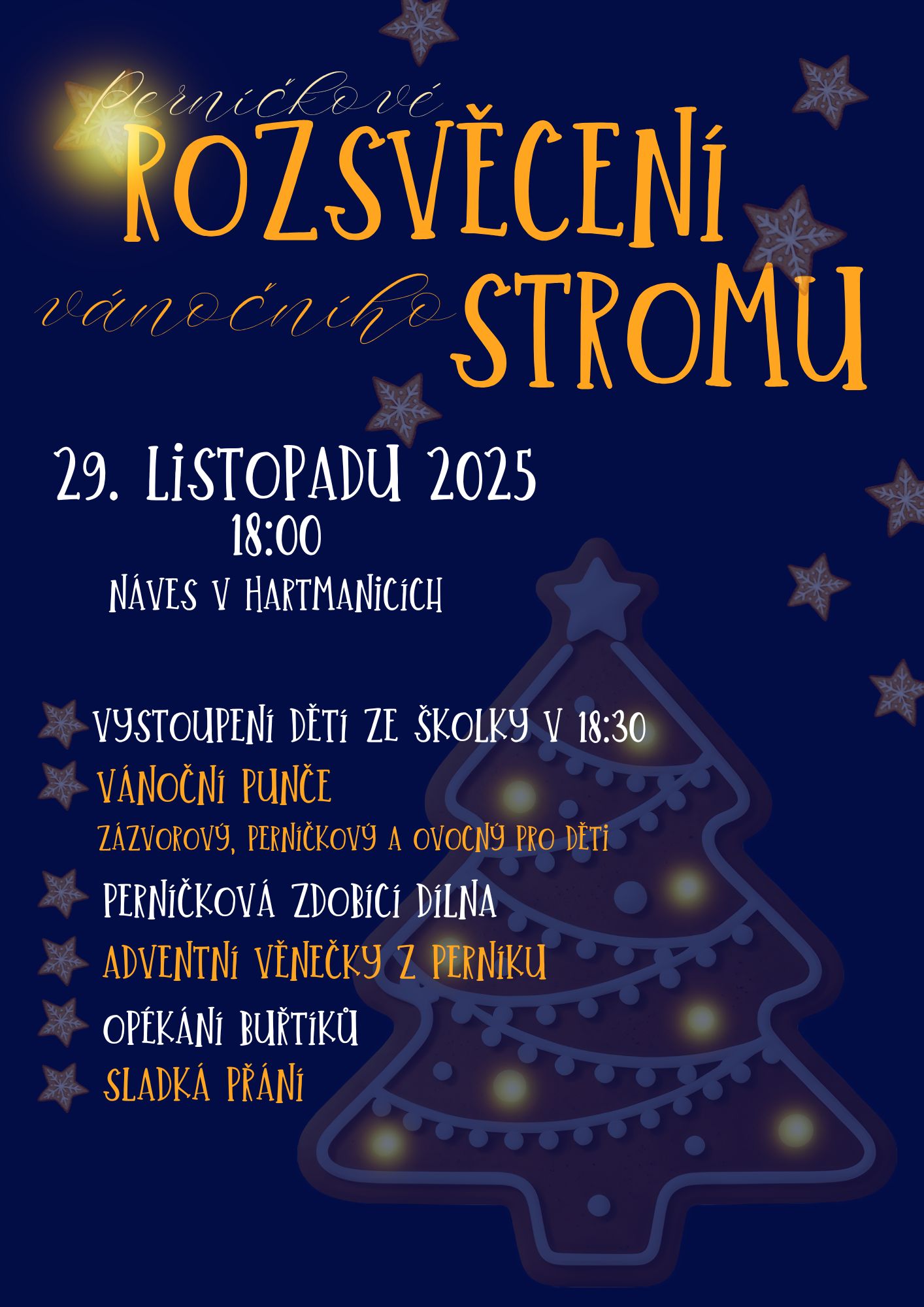 Obec Hartmanice Vás zve na náves, kde bude tradiční rozsvěcení vánočního stromu. Začátek v sobotu, 29. listopadu v 18:00 hod. |