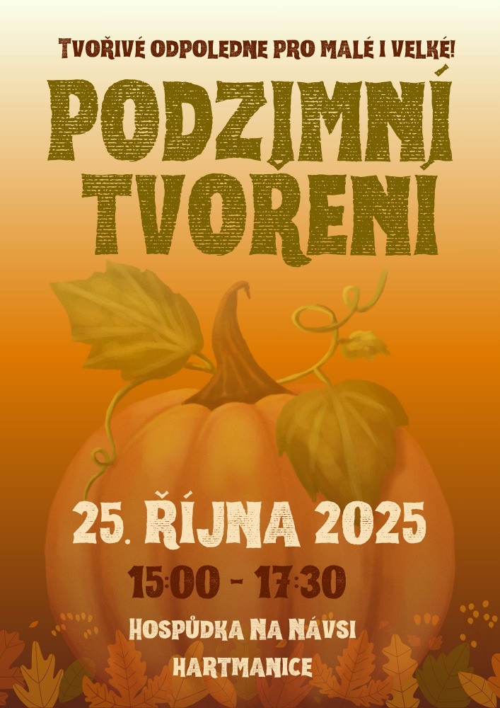 Obec Hartmanice Vás zve na podzimní tvoření. V sobotu 25. října 2025 od 15:00 do 17:30 - Hospůdka Na Návsi. Pokud možno, doneste si vlastní dekorační materiál. |