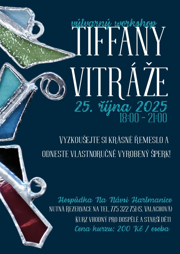 Obec Hartmanice Vás zve na výtvarný kurz - workshop "TIFANY VITRÁŽE". V sobotu 25. října 2025 od 18:00 do 21:00 - Hospůdka Na Návsi - nutná rezervace na tel. 775 322 751, cena 200 Kč / osoba. |